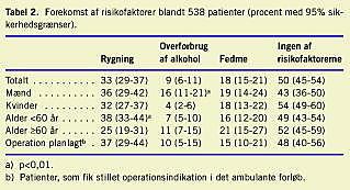 Resultater: 9% af patienterne havde et alkoholforbrug over Sundhedsstyrelsens anbefalinger, 18% havde et body mass index (BMI) ≥30 kg/m 2 , og 33% var rygere. For alle risikogrupper gjaldt, at > 80% af patienterne var motiveret for at ændre levevis, hvis sygehuset hjalp. Motivationsandelen fandtes uafhængig af køn, alder ( < eller ≥60 år) og beslutning om operation.