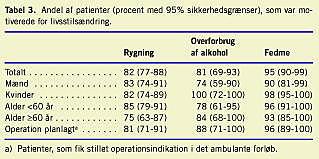 I Tabel 3 ses, at 81% af patienterne var motiverede for at reducere deres forbrug af alkohol, mens 82% var motiverede for rygeophør, og 95% var motiverede for vægtreduktion. Motivationsprocenterne var ikke afhængige af køn eller alder (< eller ≥ 60 år). Den var heller ikke signifikant afhængige af, om patienten skulle opereres eller ej.