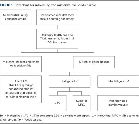 Akut opståede fokale neurologiske udfald forudgået af epileptiske anfald er en differentialdiagnostisk udfordring. Vigtigst er det at skelne TP fra iskæmisk apopleksi, som debuterer med epileptisk anfald, om end en række andre diagnoser skal overvejes og udelukkes (Tabel 1). Da TP er en udelukkelsesdiagnose, skal de mest alvorlige og behandlelige diagnoser afdækkes vha. en rationel udredningsstrategi (Figur 1). Findes TP overvejende sandsynligt, afventes spontan bedring, hvor prognosen må anses for at være god.