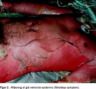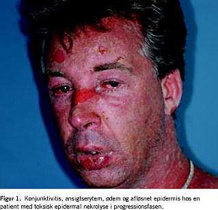 Sygdommen begynder ofte med prodromer i form af feber, alment ubehag, myoartralgier, hovedpine, synkesmerter, hoste og konjunktivitis, som kan ligne influenza eller øvre luftvejsinfektion [8]. Efter 1-3 dage fremkommer der hududslæt i ansigtet (Figur 1), på halsen og de centrale dele af kroppen med rødme eller morbilliformt eksantem, som hurtigt breder sig til ekstremiteterne. I andre tilfælde er hudforandringerne initialt mere kokardelignende og ligner erythema multiforme. De ofte ømme, grålige, livide hudelementer konfluerer, bliver ødematøse og udviser et positivt Nikolskys symptom, hvor man ved let gnidning mod huden kan få epidermis til at skride af i store flager, som efterlader væskende erosioner (Figur 2). Tilstanden kan klinisk minde om en udbredt an-dengradsforbrænding. Gennemsnitligt afficeres 70% af huden, men 100% tab af epidermis inden for 24 timer kan forekomme. Sygdommen udvikler sig ofte rykvist igennem 3-4 døgn (progressionsfasen), hvorefter den maksimale involvering af huden er nået. Patienterne har øm, brændende hud, og der udvikles blærer, som hurtigt brister og fører til smertefulde erosioner, der dækkes af nekrotisk epitel, fibrin eller hæmoragiske skorper. Slimhinderne er involveret tidligt i forløbet. Øjensymptomer er hyppige med erosiv pseudomembranøs konjunktivitis, corneaerosioner og symblefarondannelse [9]. Udbredte slimhindeforandringer i gastrointestinalkanalen kan føre til diare, blødning eller i sjældne tilfælde tarmperforation. Luftvejsepitelet kan også inddrages, hvilket man må være opmærksom på ved dyspnø og bronkial hypersekretion [10]. Hos 30% findes interstitielt lungeødem, evt. akut respiratorisk distresssyndrom. Leverpåvirkning, pan-kreatitis og nyreaffektion er mere sjældne komplikationer [11]. Biokemisk findes typisk forhøjet sænkningsreaktion, leukocytose, trombocytopeni og en normokrom, normocytær anæmi. Leukopeni kan ses og er prognostisk et ugunstigt tegn [12]. Nonspecifikke stigninger i serumaminotransferase ses på op til 2-3 gange øverste normalområde. Patienten mister proteinrig væske gennem den denuderede dermis, evt. som proteinrig diare, hvilket fører til markant fald i serumalbumin.