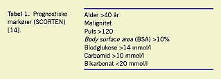 Konsekvenserne af det massive epidermistab er et stort væsketab, nedsat termoregulation, øget energitab, immunologisk påvirkning og beskadigelse af den mekaniske barriere, hvilket gør disse patienter sårbare over for infektioner [12, 13]. Sepsis er hovedårsagen til dødsfald ved TEN. Dødsfald optræder ofte efter regeneration af huden og ikke i den akutte fase, hvilket er væsentligt at holde sig for øje. Der er udviklet et valideret scoringssystem, SCORTEN (Tabel 1)), hvor man ved hjælp af syv prognostiske markører kan estimere risikoen for død hos patienter, som får understøttende hospitalsbehandling [14]. Mortaliteten hos voksne er på 25-45% [3, 12, 13, 15].