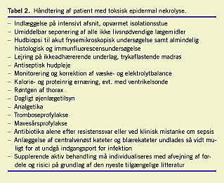 Når mistanken om TEN er til stede, må alle ikke livsnødvendige lægemidler straks seponeres, og særlig mistanke må rettes mod lægemidler, der er nyadministreret inden for de seneste fire uger [19]. Patienter med TEN skal transporteres til en dermatologisk-, brandsårs-, plastikkirurgisk- eller intensivafdeling, hvor en kollektiv tværfaglig understøttende og evt. immunmodulerende behandling er mulig (Tabel 2). Under transport til den behandlende afdeling kræves der særlig opmærksomhed på væsketerapi og atraumatisk aseptisk hudpleje. I den understøttende behandling bør der fokuseres på væske- og ernæringsterapi, lokalbehandling af huden, smertebehandling og tidlig diagnostik og behandling af infektioner. Væsketabet substitueres parenteralt, evt. suppleret med tilførsel af kolloider og saltvand [8, 12, 20]. Som hovedregel anbefales det, at man de første 24 timer tilfører to tredjedele af den væske, som anbefales til brandsårspatienter [12]. Hydreringsstatus kan vurderes ved hjælp af timediurese og daglig vejning [21]. Kateter à demeure skal dog ikke rutinemæssigt anlægges grundet patientgruppens høje infektionsmodtagelighed. TEN-patienter har en øget metabolisme, hvorfor en tidlig aggressiv ernæring, evt. med ventrikelsonde, er nødvendig for at modvirke albuminfaldet [12]. Lejring kan ske på aluminiumsfolie (Metaline) og trykaflastende madras (optimalt luftpudeseng). Patienterne behandles på varmestue med en rumtemperatur på 30-33 °C, hvilket nedbringer metabolismen [5]. Aseptisk håndtering mindsker infektionsrisikoen. Hudplejen bør superviseres af en dermatolog. Til afvaskning og evt. smøring af huden anvendes lokale antiseptiske midler såsom 0,1-0,5% sølvnitrat, 0,003% kaliumpermanganat eller 0,02-0,05% chlorhexidin [20, 22, 23]. Hydrogel eller sølvimprægnerede bandager kan også anvendes til lokalbehandling. Områder med denuderet hud og eksponeret dermis skal beskyttes for at bedre varmekontrollen og reducere væsketabet, smerterne og risikoen for bakterievækst. Der anbefales ikkeadhererende bandager (eksempelvis Mepitel). Områder med epidermisdække skånes mod traumer, og den endnu fastsiddende epidermis bevares så vidt muligt, idet der hurtigt vil ske en reepitelialisering underneden. Afløst og nekrotisk epidermis bør dog fjernes forsigtigt med sterile saltvandsimprægnerede gazeswabs. Skorper i ører, næse og mund fjernes dagligt for at forhindre superinfektion og parotitis. Der kan anvendes antiseptiske og lokalbedøvende midler til mundpleje. Slimhindelæsionerne i øjne kræver speciel opmærksomhed med dagligt øjenlægetilsyn.