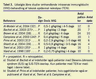 Restitutionen er langsom og varer 3-6 uger. I efterforløbet kan der være behov for psykisk bearbejdning af den intensivt behandlede sygdom. Prognosen for TEN-patienter er ringere end for brandsårspatienter med samme udbredelse af hudlæsioner. Glukokortikoidbehandling er et tveægget sværd, som på den ene side dæmper progressionen, men samtidig øger risikoen for komplikationer såsom sepsis og gastrointestinal blødning ligesom reepitelialiseringen vil forlænges [11, 15, 22]. Når sygdommen er fuldt udviklet, og patienten først er indlagt på en specialafdeling, er der formentlig ingen samlet nytte af kortikosteroider [7]. Korterevarende højdosis steroidbehandling i den initiale erytrodermiske sygdomsfase kan dog overvejes [26]. Ciclosporin og TNF-alfa-hæmmere har været anvendt og synes at være lovende, men effekten skal først dokumenteres i randomiserede, kontrollerede multicenterstudier af veldefinerede patientpopulationer [7, 25, 36]. Erkendelse af dysreguleret Fas-signalering og betydning af TNF-alfa har åbnet for nye terapeutiske muligheder. IVIG indeholder specifikke anti-Fas-antistoffer, som kan hæmme Fas-ligand-medieret apoptotisk celledød [18]. IVIG kan ydermere mindske risikoen for livstruende infektioner. IVIG har få bivirkninger, herunder nefrotoksicitet, men behandlingen er kostbar. I et stigende antal meddelelser dokumenteres der hurtig effekt af IVIG-behandling [31-35], mens man i andre opgørelser ikke kan vise behandlingseffekt eller ligefrem antyder, at der er en dårligere overlevelse hos IVIG-behandlede end hos en gruppe patienter, der ikke har fået IVIG [37-39]. I Tabel 3 ses en oversigt over åbne prospektive og retrospektive behandlingsstudier med IVIG. Tabellen indeholder alle publicerede studier, som omfatter mindst ti patienter. Effekten synes at variere afhængigt af dosis, tidspunkt for behandling og præparatvalg. Af hensyn til den potentielle nefrotoksiske effekt anbefales IVIG-præparater uden saccharose [40]. Endnu mangler de nødvendige, randomiserede, kontrollerede undersøgelser, så man kan afgøre, om IVIG-behandling må anbefales til rutinemæssig brug ved denne alvorlige akutte sygdom. Sygdommens sjældenhed gør det dog vanskeligt at gennemføre randomiserede, kontrollerede behandlingsstudier og opnå konklusive resultater. Faren ved at lade IVIG blive guldstandard på nuværende tidspunkt er, at man ikke får gennemført de nødvendige kliniske studier af behandling med bl.a. glukokortikoider og ciclosporin. Fremtiden vil formentlig også byde på flere behandlingstudier med anti-TNF-alfa-antistoffer.