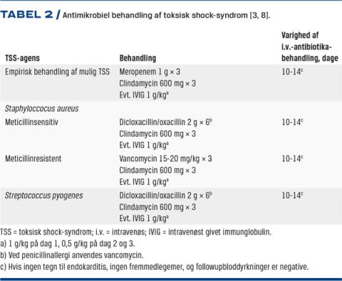 I den initiale fase, hvor den mikrobielle organisme er ukendt, påbegyndes der bredspektret antibiotisk behandling efter gennemdyrkning [3]. Utilstrækkelig antibiotisk behandling hos patienter med septisk shock øger dødeligheden 1,4-8 gange [21, 22]. Ofte vil der være behov for stabiliserende behandling på en intensivafdeling med væskeresuscitation, brug af vasopressor, inotropika og mekanisk ventilation [3]. Grundig fokusjagt er vigtig, herunder med billeddiagnostik. Ved et inficeret sår bør der foretages kirurgisk debridement. Sår efter kirurgi bør også mistænkes som indgangsport, selvom de fremstår upåfaldende. Abscesser skal dræneres. Ved lav tærskel skal der foretages gynækologisk undersøgelse med fjernelse af fremmedlegemer (tampon og spiral) [3, 8, 19]. Valget af antibiotisk behandling beror på in vitro-studier. Der findes ikke kliniske studier, hvor man har sammenlignet antibiotiske behandlinger ved TSS. Behandlingen har tre mål, at: 1) dræbe bakterier, 2) reducere de levende bakteriers produktion af eksotoksin og 3) inaktivere de allerede cirkulerende toksiner. For nuværende anbefales brug af betalactampenicillin i kombination med clindamycin og evt. intravenøst givet immunglobulin (IVIG) (Tabel 2). Penicilliner inhiberer syntesen af bakteriernes cellevæg og virker bakteriocidt [9]. Som empirisk behandling ved mistanke om TSS bør man vælge meropenem. Hvis den kliniske diagnose efterfølgende bekræftes mikrobiologisk, kan antibiotikabehandlingen smalnes ind i henhold til resistenssvar. Ved mistanke om infektion med methicillinresistent S. aureus (MRSA) bør der tillægges vancomycin, indtil MRSA-infektionen er be- eller afkræftet. Såfremt MRSA-TSS bekræftes, kan meropenem seponeres [8]. Det anbefales at give mindst 10-14 dages intravenøs antibiotikabehandling, da der er rapporteret om tilbagefald efter otte dage [8]. Clindamycin er et bakteriostatisk antibiotika, som binder reversibelt til 50S-subunit på bakteriernes ribosomer og forhindrer dannelsen af 70S-ribosomalkomplekset. Herved hæmmes bakteriernes proteinsyntese og dermed syntesen af Sag [9]. Overlevelsen øges ved brug af betalactamantibiotika og clindamycin i kombination [23, 24]. IVIG udvindes fra bloddonationer og består primært af immunglobulin G. IVIG binder og inaktiverer cirkulerende SAg, hvorved cytokinstormen dæmpes. Et studie har vist, at overlevelsen øges med 37% ved denne behandling [7, 23]. Den kliniske brug er dog kontroversiel. Pga. sygdommens sjældenhed findes der kun få studier med mennesker, hvorfor der ikke foreligger nogle retningslinjer. IVIG kan dog overvejes hos patienter med TSS. Brugen af steroid i behandlingen af TSS er omdiskuteret. In vitro-studier har vist, at dexamethason inhiberer den TSST-1-medierede cytokinproduktion [25]. Enkelte kasuistiske rapporter har vist mulig gavnlig effekt af steroid, dog viste et retrospektivt case-kontrol-studie ingen reduktion i mortalitet, og p.t. har steroid ingen plads i behandlingen af TSS [8, 26, 27].