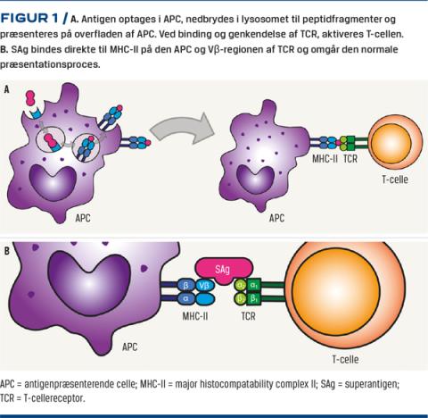 Der er identificeret 24 Staphylococcus-SAg og 12 Streptococcus-SAg. De mest almindelige er toksisk shock-syndrom-toksin-1 (TSST-1), enterotoksin B og C, streptococcal mitogenic exotoksin Z og streptococcal pyrogenic exotoksin A, B, C, F, G og J [9]. Normalt optages antigener (Ag) af antigen-præsenterende celler (APC). Ag nedbrydes i lysosomer til peptidfragmenter, som præsenteres til T-cellerne på major histocompatibility complex-II (MHC-II) (Figur 1A) [3]. T-cellerne aktiveres kun, hvis de genkender Ag. T-celle-receptoren (TCR) består af en α- og en β-subunit. β-subunitten består proksimalt af en konstant del og distalt af en variabel (V) del, kaldet Vβ. Vβ bindes til peptid-MHC-komplekset. SAg omgår den normale antigenpræsentation og bindes direkte på MHC-II på den APC og Vβ (Figur 1B) [9]. Bindingen mellem SAg og Vβ skaber en klonal ekspression af T-celler, der udtrykker netop denne Vβ. Ag-præsentation aktiverer normalt 0,01% af de cirkulerende T-celler, hvorimod bindingen mellem SAg og TCR kan aktivere 20-30% [13]. Denne aktivering skaber en cytokinstorm med massiv ekspression af proinflammatoriske mediatorer. Fra T-cellerne lymfotoksin-α, interleukin-2 og interferon-γ og fra APC tumornekrosefaktor(TNF), interleukin-1β og interleukin-6. Alle inducerer feber og interleukin-1 også muskelproteolyse [3, 14]. Klassiske infektionstegn kan være sparsomme, da SAg via overproduktion af TNF hæmmer makrofaginfiltrationen i det inficerede område. Produktionen af SAg er underlagt en kompleks regulatorisk genkontrol, der kan påvirkes af bl.a. pH-værdi, temperatur, ilttension og nedbrydningsprodukter fra hæmoglobin [15]. Ydermere har TSST-1 direkte effekt på karrene og skaber kapillærlækage og hypotension. 5-50% af S. aureus kan skabe TSST-1. Mere end 90% af patienterne med MTSS er S. aureus-TSST-1-producerende, mens det for NMTSS er 60-75% [8]. Et studie fra Wisconsin viste, at over 90% af befolkningen var seropositive for TSST-1 ved 25-årsalderen. TSS med TSST-1 rammer stort set kun de 10% af befolkningen, som ikke har udviklet immunitet mod TSST [8, 16]. 50% af de patienter, der rammes af TSS, serokonverterer ikke og er i øget risiko for en ny episode med TSS [17]. Omkring en tredjedel af patienterne med MTSS rammes af gentagne tilfælde af MTSS [18]. Mulige forklaringer på den manglende udvikling af immunitet er, at toksinet skaber en midlertidig immunsupprimeret tilstand, hvor dannelsen af anti-TSST-1 inhiberes. Det Sag-medierede cytokinrespons aktiverer ikke Th-2-celler, hvormed B-cellerne ikke proliferer og differentierer. Det er også velkendt, at høje koncentrationer af TSST-1 inducerer B-celle-apoptose [3, 17].