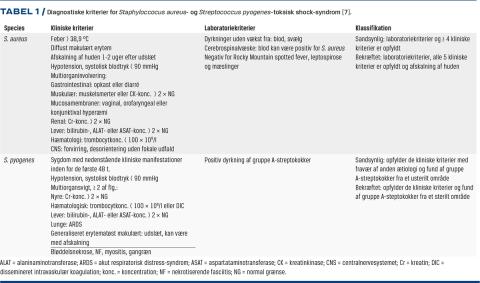 Symptomerne og de klinske tegn ligner dem ved S. aureus-TSS, initialt med influenzalignende symptomer. S. pyogenes-udløst TSS skyldes som oftest en invasiv infektion, f.eks. en bløddelsinfektion som nekrotiserende fasciitis, cellulitis eller myositis med smerter ude af proportion med den kliniske tilstand, men ses også ved pneumoni, peritonitis, osteomyelitis og myometris [3, 9]. Patienterne med S. pyogenes-udløst TSS udvikler sjældnere udslæt end patienterne med S. aureus-udløst TSS, og det er af mere skarlatiniform type, ofte med vesikler, blistre og bullae [7]. Diagnosen stilles ved en kombination af kliniske, biokemiske og mikrobiologiske kriterier som ses i Tabel 1. Modsat S. aureus-udløst TSS, hvor kun 5% af bloddyrkningerne er positive, er op til 90% af dyrkningerne positive ved S. pyogenes-udløst TSS. Dette kan bekræfte diagnosen [3, 20].