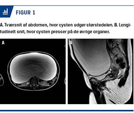 tilstand med mange ætiologier, og størstedelen af ovarietumorerne er godartede funktionelle cyster. Ca. 15% af disse består af epiteliale tumorer. Differentialdiagnoser i denne aldersgruppe er cyster, ovarietorsioner, benigne og maligne tumorer, leukæmi, der involverer æggestokkene, lymfomer og metastaser [2]. Den hyppigst forekommende type af epiteliale tumorer er det benigne cystadenom, og her er alderen på diagnosticeringstidspunktet hos børn ca. 14 år. Cysteadenomer debuterer med en stor variation af kliniske symptomer som f.eks. øget abdominalomfang, mavesmerter, opkastninger, forstoppelse samt ovarietorsion og -bristning. Der er også et potentiale for evt. recidiv, og det er ikke usædvanligt, at der er forekomst på begge ovarier. Dog har det ikke potentiale for malignitetsudvikling [3]; ofte oplever patienterne blot et hurtigtvoksende abdominalomfang og uspecifikke mavegener. Dette forholdsvis vage symptombillede giver en øget risiko for, at man som sundhedsperson fejltolker det som overvægt. Formålet med denne kasuistik er derfor at sætte fokus på diagnosen og på trods af tilstandens sjældenhed opfordre til at overveje den hos unge piger med uspecifikke mavegener, voksende abdominalomfang og negativ graviditetstest.
