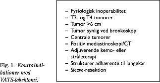 I perioden oktober 1999 til december 2000 (14 mdr.) har afdelingen gennemført ti VATS-lobektomier for primær ikke-småcellet lungecancer. Derudover har vi indledt med VATS-lobektomi i yderligere fire tilfælde, hvor vi under operationen i større eller mindre grad måtte udvide incisionen og afslutte med en åben procedure med brug af spærre i thoraxvæggen. Vores indikation for VATS-lobektomi er perifert beliggende tumor i TNM-stadie I (T1N0M0 og T2N0M0). De internationalt anbefalede kontraindikationer fremgår af Fig. 1. Data om histologisk type, TNM-klassifikation og risikofaktorer for patienterne opereret på vores afdeling fremgår af Tabel 1 (Tabel 1).