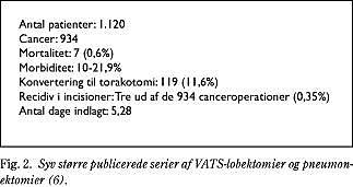 Siden det første offentliggjorte materiale om torakoskopiske lobektomier i 1992 (2) har denne procedure været centrum for stor interesse og også skepsis. Hurtigt blev de første serier, som udelukkende omhandlede VATS-lobektomier ved lungecancer, offentliggjort (3). Der var ikke tale om randomiserede studier, men resultaterne antydede, at den torakoskopiske operation gav kortere indlæggelser og færre smerter.