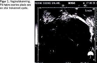 Maven var blød, men der var kraftig ømhed i højre fossa. Ved en gynækologisk undersøgelse blev der fundet normale forhold, fraset kraftig ømhed ved eksploration i højre fossa. En vaginalskanning viste en normal uterus. På højre ovaries plads så man en stor trekamret cyste på 4 × 8 cm uden ekskrescenser (Figur 1 ). Venstre ovarie var normalt.