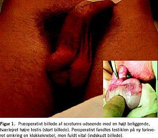 To år senere blev den samme patient indlagt med pludseligt opståede smerter, nu i højre testis. Ved en objektiv undersøgelse fandtes patienten afebril, men udtalt smertepåvirket. En undersøgelse af scrotum viste højre testis optrukket, tværlejret og udtalt øm ved palpation. Forsøg på detorkvering var ikke muligt pga. svær smertereaktion selv ved let palpation. Ved akut operation fandtes testis torkveret omkring en typisk klokkeknebel og efter detorkvering fandtes testiklen at være vital og med naturligt udseende (Figur 1 ). Testis blev på ny fikseret, og den kontralaterale testis blev yderligere fikseret med to absorberbare suturer. En efterfølgende kontrolultralydskanning viste normale forhold i begge testes og epididymis.