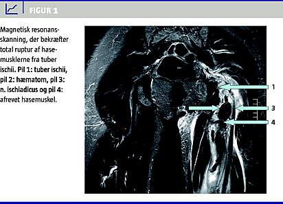 Ved den objektive undersøgelse på skadestuen lå patienten med flekteret knæ og indadrotation i hoften. Ved palpation fandt man ømhed i muskelbugen bag på låret og proksimalt ved hasemusklernes insertion på tuber ischii. Der var fri passiv bevægelse af hofte og knæ. Knæundersøgelsen viste normale forhold. Ved en røntgenundersøgelse af bækkenet påviste man hverken frakturer eller knogleafsprængninger. Den efterfølgende dag blev der efter ambulant vurdering udført en magnetisk resonans (MR)-skanning, som bekræftede total ruptur af hasemusklerne fra tuber ischii (Figur 1 ).
