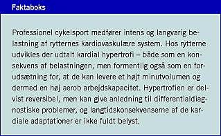 Professionelle cykelryttere har udtalt excentrisk hypertrofi af cor. Det er mere reglen end undtagelsen, at hjertets kammerdimensioner overskrider de normale grænseværdier. Den kardiale adaptation er formentlig en konsekvens af voluminøse træningsmængder med både volumen og trykbelastning af cor, men også en forudsætning for at kunne præstere og have succes som cykelrytter. Nedsat LVEF forekommer i hvile, men denne normaliseres formentlig under arbejde. Excentrisk hypertrofi sammenholdt med forbedret diastolisk ventrikelfunktion muliggør betydelige stigninger i slag/minut-volumen og dermed høj arbejdskapacitet. Andre fysiologiske forhold inklusive muskulære metaboliske processer, restitutionsevne og psykiske resurser er vigtige for en professionel cykelrytter, men frem for alt synes det at være nødvendigt at have et »stort hjerte«.