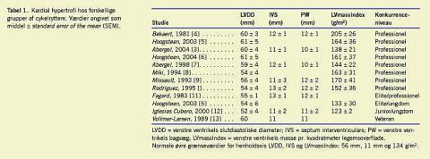 Normale øvre grænser for venstre ventrikels slutdiastoliske diameter, vægtykkelse og masse er henholdsvis 56 mm, 11 mm og 134 g/m2 legemsoverflade. Dog accepteres sædvanligvis diameter og vægtykkelse af venstre ventrikel på 60 mm og 13 mm hos eliteidrætsfolk. Deltagerfeltet i Tour de France 1995 og 1998 fik foretaget ekkokardiografi inden løbets start [3]. Over halvdelen af rytterne havde venstre ventrikel slutdiastolisk diameter over 60 mm, og 75% lå over den øvre normalgrænse for kontrolgruppen (57,4 mm). Størst målte værdi var 73 mm. Venstre ventrikels vægtykkelse var over 13 mm hos 8,7%, og dette forekom hyppigst ved samtidig dilatation af hjertet. Som det fremgår af Tabel 1 , er der også i andre studier fundet værdier langt over de normale grænseværdier. Excentrisk hypertrofi er helt dominerende, men der ses også en vis hypertrofi af muskelvæggen og den samlede masse af venstre ventrikel er betydelig forøget. I øvrigt bemærker man, at hypertrofien er mere udtalt hos professionelle end hos dem, der konkurrerer på lavere niveau. Graden af hypertrofi synes også at være afhængig af alderen og er mindst udtalt hos de yngste ryttere.