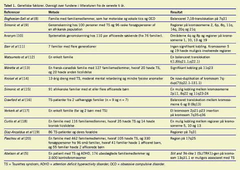 Der er ingen tvivl om, at TS har en delvis genetisk baggrund. I store familieundersøgelser har man påvist at førstegradsslægtninge (forældre og helsøskende) til personer med TS har 10-15% risiko for også at have syndromet, og 15-20% har risiko for at have en anden kronisk ticslidelse. I den samme gruppe er der 10-15% risiko for at have OCD [2]. Disse risici er langt over baggrundsbefolkningens prævalens for de samme tilstande, nemlig 0,6% for TS, 6,6% for kronisk ticslidelse [3] og 0-4% for OCD [4].