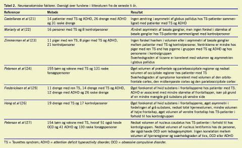Selv om der i den eksisterende litteratur er fundet uoverensstemmende resultater, er der ingen tvivl om, at såvel genetiske som neuroanatomiske faktorer og neurotransmittere spiller en rolle ved TS. Nogle af studierne er foretaget med små grupper, og på grund af forskellige studiedesign er de svære at sammenligne.