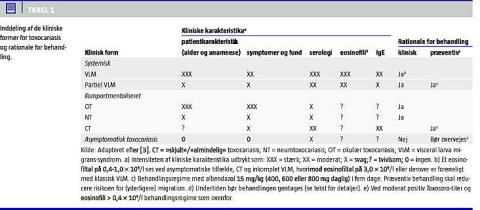 »Visceral larva migrans«(VLM) ses næsten udelukkende hos to- til syvårige, hvor geofagi og hundehold i hjemmet er typiske risikofaktorer [3]. Kliniske tegn og symptomer ses især fra lever og lunger og omfatter hepatomegali, hoste, bronkospasmer, mavesmerter, myalgier, artralgier, anoreksi, rastløshed, feber og astma. Der ses ofte persisterende eosinofili, leukocytose, hypergammaglobulinæmi, herunder forhøjet total-IgE, anæmi og hypoalbuminæmi [5, 14] (Tabel 1).