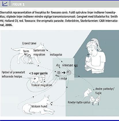 Toxocara -infektion skyldes typisk utilsigtet indtag af æg fra den fuldmodne orm eller larver som følge af eksposition for f.eks. jord (geofagi/pica), indtagelse af kontaminerede grøntsager eller Toxocara -holdigt kød (Figur 1 )[1, 4, 6]. Toxocariasis er en typisk zoonose, og der sker ikke smitte mellem mennesker.