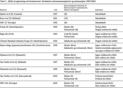 Af Tabel 1 fremgår det, at tendensen i litteraturen går mod stadig større evidens for positiv effekt af rygtræning ved subakutte og vedvarende LS og evidens for manglende effekt af rygtræning ved akutte LS. Ved effekt af rygtræning forstås sædvanligvis reduktion af symptomerne, bedret udførelse af almindelige daglige gøremål, reduktion af analgetikaforbruget samt patientens generelle tilfredshed med resultatet af interventionen. Rapporternes konklusioner er i alle tilfælde baseret på emnerelevante videnskabelige undersøgelser herunder i særlig grad randomiserede kliniske undersøgelser.