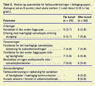 Som det ses af Tabel 2 havde de studerende høje forventninger til kurset og de opstillede læringsmål Med hensyn til gennemførlighed var der enighed (8 på en skala fra 1 til 8) om, at kursets pædagogiske tilrettelæggelse som fællesundervisning var nødvendig for opnåelsen af færdigh eder i tværfaglig samarbejde og kommunikation. Ligeledes fandt de fleste [8], at kurset var særdeles relevant i forhold til deres placering i uddannelsesforløbet.