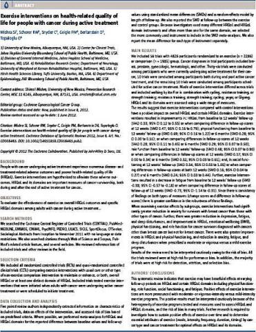 Mishra SI, Scherer RW, Snyder C et al. Exercise interventions on health-related quality of life for people with cancer during active treatment. Cochrane Database Syst Rev 2012;8:CD008465.