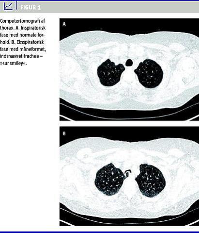 En 70-årig kvinde blev henvist fra en speciallæge i lungemedicin til højresolutionscomputertomografi (HRCT) af thorax på mistanke om pulmonal årsag til tre års kraftig hoste. Periodevist var denne hoste socialt invaliderende, og patienten havde været igennem en længere udredning og forskellige behandlingstiltag uden effekt. Der var taget røntgen af thorax, røntgen af øsofagus, udført laryngoskopi, forsøgt protonpumpehæmmer mod reflukssymptomer og givet beta-2-agonist på mistanke om astma. Den primære mistanke var på dette tidspunkt bronkieektasier eller interstitiel lungesygdom. Der blev foretaget HRCT i såvel inspiratorisk som eksspiratorisk fase, og undersøgelsen viste normale forhold i lungeparenkymet i begge faser samt normale forhold i trachea i inspirationsfasen (Figur 1 A). Men i eksspiratorisk fase så man tydeligt, hvorledes trachea komprimeredes markant, således at lumen fremstod indsnævret og halvmåneformet i hele tracheas forløb og faktisk tillige i hovedbronchi (Figur 1B), således at der var tale om trakeobronkomalaci. Man kan billeddiagnostisk mnemoteknisk karakterisere dette mønster som en »sur smiley", og det er helt foreneligt med diagnosen TM. Desuden sås der hos denne patient et atypisk forløb af øsofagus, som fik en pseudoudposning i eksspiratorisk fase. I inspiratorisk fase kunne ingen af disse anomalier ses, og således er eksspirationsfasen helt essentiel for diagnostikken.