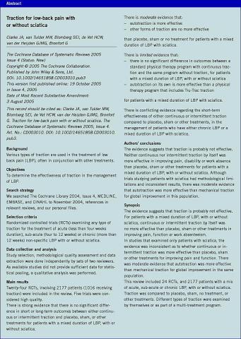 <li>Clarke JA, van Tulder MW, Blomberg SEI et al. Traction for low-back pain with or without sciatica. The Cochrane Database of Systematic Reviews 2005, Issue 4. Art. No.: CD003010. DOI: 10.1002/14651858.CD003010.</li>