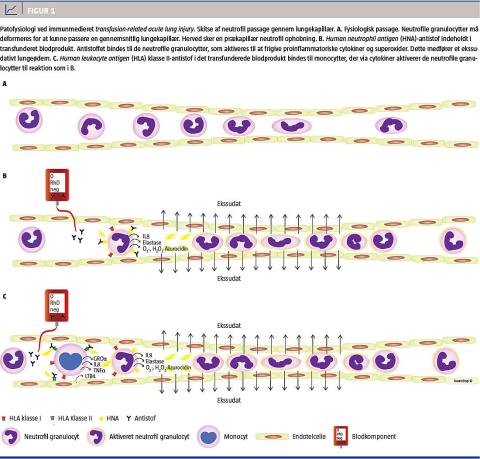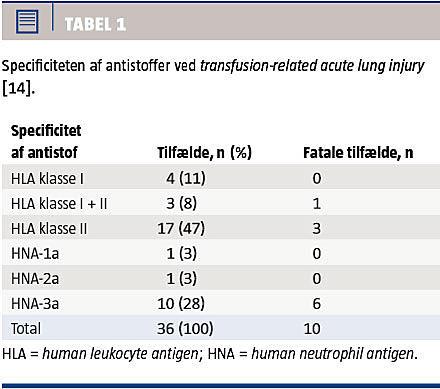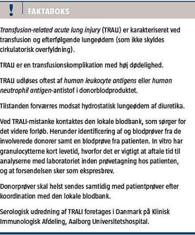 Transfusionsterapi med blodkomponenter er i Danmark generelt en sikker behandling med lille risiko for alvorlig komplikation. Den hyppigste årsag til transfusionsrelateret mortalitet og alvorlig morbiditet i den vestlige verden i dag anses for at være immunmedieret transfusion-related acute lung injury (TRALI) [1-3]. Klinisk udvikler lidelsen sig typisk dramatisk med respirationsinsufficiens under eller op til seks timer efter transfusionen. TRALI skyldes en granulocytmedieret skade på lungevævet, oftest udløst af antistoffer fra blodkomponenten rettet mod vævstypeantigener (human leukocyte antigens, HLA) og granulocytantigener (human neutrophil antigen, HNA). Popovsky & Moore introducerede termen TRALI i 1985 for at fremhæve den patofysiologiske lighed med acute lung injury (ALI) [4]. TRALI formodes at være stærkt underdiagnosticeret.