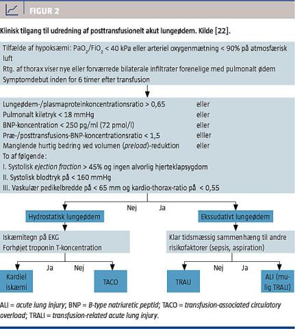 Det kan være vanskeligt at anvende konsensusdefinitionen i den kliniske hverdag. Differentialdiagnostisk er det specielt tilstande som kardiogent lungeødem eller transfusionsrelateret cirkulatorisk overload, som volder problemer. En klinisk tilgang til udredningen er skitseret i algoritmen i Figur 2 [22]. Det er ikke klinisk muligt at skelne mellem TRALI og ALI, fraset en historik om nylig transfusion. Transfusion er én af de mange faktorer, der kan initiere udvikling af ALI [23]. Derfor udelukkes patienter med eksisterende ALI ofte i TRALI-studier [24]. Derved er der risiko for en betydelig underdiagnosticering af TRALI.
