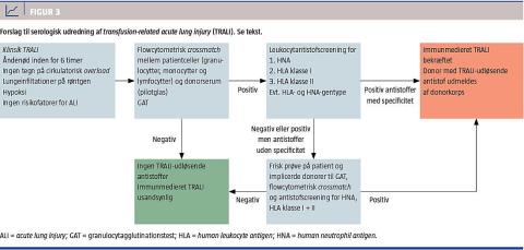 Selvom TRALI-diagnosen stilles på kliniske kriterier, er den immunologiske udredning vigtig, idet diagnosen kan understøttes, og donorer med TRALI-udløsende antistoffer kan opspores. Med udgangspunkt i anbefalinger fra The International Society of Blood Transfusion [27] foreslår vi en immunologisk udredningsalgoritme, som er tilpasset danske forhold (Figur 3). Ved første led i udredningen undersøges donorplasma (pilotglas eller ny prøve) og en frisk blodprøve fra patienten (7,5 ml ethylen-diamin-tetra-acetat-blod og 9 ml blod uden tilsætning). Der foretages granulocytagglutinationstest og flowcytometrisk crossmatch mellem patientleukocytter (monocytter, granulocytter og lymfocytter) og donorplasma. Disse to undersøgelser kan med høj sensitivtet afsløre, om donors blod indeholder antistoffer, der kan udløse en TRALI-reaktion hos patienten [1]. I tilfælde af positiv crossmatch undersøges leukocytantistoffernes specificitet ved en antistofscreening af donor for HNA-, HLA klasse I- og II-antistoffer.