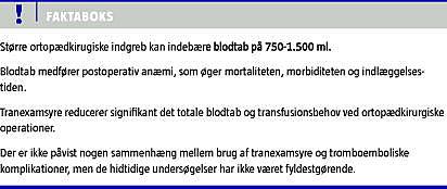 Summary Tranexamic acid reduces blood loss after large orthopaedic operations Ugeskr Læger 2012;174(1):47-49 Anaemia in surgical patients has been proven to increase morbidity and mortality. Due to the risk of adverse effects and the cost of blood transfusions it is important to reduce the need for transfusions by pre- and intra-operative interventions. Tranexamic acid has long been used in orthopaedic surgery as an antifibrinolytic agent. Several studies within the orthopedic fields have underlined the effect of the drug in reducing blood loss and need for transfusions. However, more studies are needed to examine the optimal dosage and administration along with the risks associated with the drug.