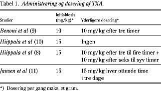 I studierne har der ikke været konsensus omkring den optimale dosering af tranexamsyre (Cyklokapron) ved TKA. Der er anvendt varierende doser fra 10 mg/kg som bolusinjektion indgivet kort før slip af blodtomhed efterfulgt af samme dosering tre timer postoperativt, til bolusinjektion på 15 mg/kg indgivet 30 min før anlæggelse af blodtomhed efterfulgt af samme dosis hver ottende time i de tre følgende postoperative døgn. Der blev maks. givet 1 gram per dosering (Tabel 1 ).
