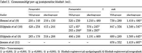 Der foreligger fire gode prospektive, randomiserede og dobbeltblindede undersøgelser (8-11), hvor patienterne randomiseredes til ækvivalente doser tranexamsyre (Cyklokapron) eller fysiologisk saltvand (placebo). Patientmaterialerne var i hvert studie sammenlignelige mht. demografiske data, operationstid, peroperativt blodtab, om protesekomponenterne var cementerede eller ucementerede, »dræntid«, NSAID-forbrug, tidligere knækirurgi samt om der blev anvendt femurprop. Indikationen for knæalloplastik var enten artrose eller osteonekrose, og der blev kun foretaget unilateral total knæalloplastik.