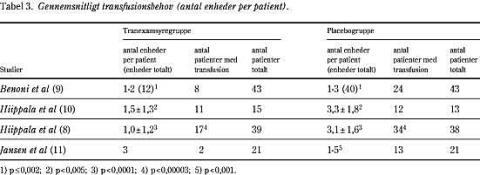 Transfusionsbehovet fandtes at være reduceret med 1/2-2/3, når tranexamsyre blev givet profylaktisk - udtrykt som færre transfusionsenheder (SAG-M) fordelt på et mindre antal patienter (Tabel 3 ). Det gennemsnitlige Hb-niveau var det samme i de respektive grupper, hvilket sikrede, at transfusion ikke blev udløst pga. præoperativ anæmi. Den postoperative Hb-koncentration var signifikant højere i TXA-grupperne trods færre transfusioner i disse grupper (8, 10).