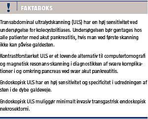 Akut pankreatitis er en sygdom, der forårsager lokal inflammation. Sygdommen har en tidlig og en sen fase, hvad angår komplikationer og mortalitetsrisiko [1, 2]. Galdesten er sammen med overforbrug af alkohol hovedårsagerne til akut pankreatitis [1]. Transabdominal ultralydskanning (ULS) har i mange år været en vigtig bestanddel i den ætiologiske udredning af akut pankreatitis, men undersøgelsens forskellige modaliteter bør i stigende grad også anvendes ved både tidlige og sene komplikationer i forbindelse med akut pankreatitis. Vi skildrer i følgende gennemgang, hvornår og hvorfor transabdominal ULS, kontrastforstærket ULS og endoskopisk ULS er indiceret ved akut pankreatitis.