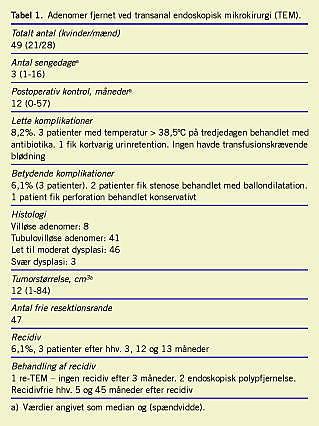 Konklusion: Vore resultater er sammenlignelige med resultaterne af de største udenlandske opgørelser. Recidivraten svarer til raten ved rectumkirurgi ved åben såvel som laparoskopisk adgang og er langt mindre end for traditionel transanal kirurgi. Risikoen for komplikationer er på niveau med risikoen ved laparoskopisk adgang og væsentligt lavere end risikoen ved åben adgang. For at optimere metoden yderligere er det nødvendigt med udvikling af den præoperative diagnostik. Det bør undersøges, om flere udvalgte patienter med T2-adenokarcinomer kan behandles med TEM i kombination med strålebehandling.