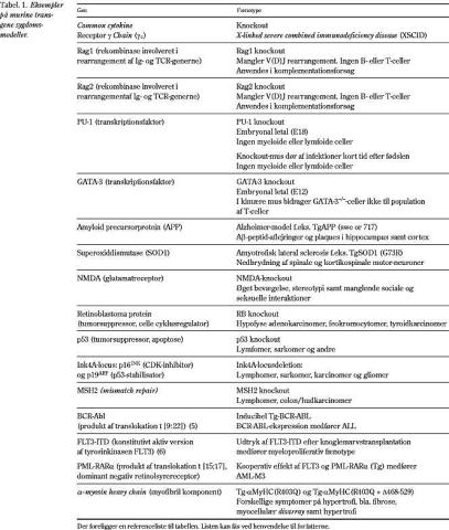 Et af de områder, hvor transgene mus har gjort størst nytte, er inden for stamcelleforskningen, der som bekendt er inde i en rivende udvikling i disse år. Her har man f.eks. anvendt »markør«-mus, som udtrykker det fluorescerende protein green fluorescent protein (GFP), til at vise, at knoglemarvsceller er i stand til at repopulere ikke alene det hæmatopoetiske system, men også andet væv såsom, hjerne, lever og muskler, når de bliver transplanteret til en letalt bestrålet recipient (1, 2). Selv om det inden for stamcellefeltet diskuteres indædt, om det specifikt er hæmatopoetiske stamceller eller »forurenende« cellepopulationer i knoglemarven, som giver ophav til denne repopulation, er de potentielle kliniske implikationer af denne observation enorme.