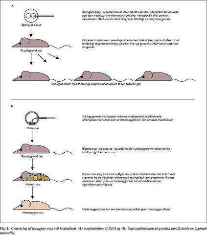 Om end ovennævnte GFP-mus har været overordentlig nyttige redskaber, åbner mere raffinerede »designede« mus et helt andet niveau af muligheder for at studere genetisk betingede sygdomme og samspillet mellem forskellige genprodukter. Med den nuværende teknologi er man i stand til at manipulere det murine genom essensielt som man ønsker, således at man præcist kan efterligne de genetiske forandringer, som forekommer i en lang række humane sygdomme. Som et yderligere raffinement tillader teknologien også, at de introducerede forandringer kun kommer til udtryk i de væv, man måtte ønske. Der eksisterer principielt to metoder til at ændre det murine genom (Fig. 1 ). I den mest simple injiceres DNA, der koder for det ønskede gen, og diverse regulatoriske sekvenser, som styrer vævsspecifik ekspression, direkte ind i pronucleus af en befrugtet oocyt, som efterfølgende implanteres i en pseudogravid mus (Fig. 1A). Ved denne procedure integrerer det injicerede DNA i et tilfældigt locus i genomet, og alt efter integrationsstedet kan man opnå et højt eller et lavt og et mere eller mindre vævsspecifikt udtryk af transgenet. Mere subtile og præcise genetiske forandringer såsom punktmutationer, deletioner, reciprokke translokationer osv., bliver introduceret vha. såkaldt homolog rekombination i murine embryonale stamceller (ES-celler). Ved denne metode integrerer DNA'et i et på forhånd udvalgt locus. Disse manipulerede ES-celler bliver derpå injiceret i museembryoner på blastocyststadiet, som efter implantation i en pseudogravid hun giver ophav til kimære mus (Fig. 1B). Disse mus består af en blanding af celler, der er afledt fra det oprindelige museembryo og fra de injicerede celler. Selektiv avl identificerer derpå de mus, hvor den genetiske ændring bliver nedarvet, og disse mus avles derpå med henblik på vævsspecifik ekspression af den genetiske forandring og/eller homozygositet.