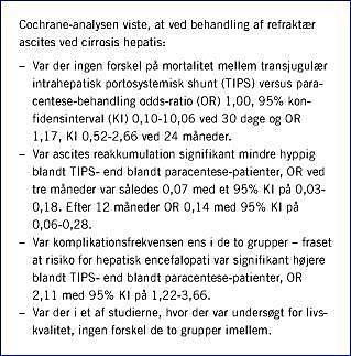 I Cochrane-analysen [5] blev det fundet, at risikoen for ascitesreakkumulation var signifikant lavere ved TIPS-behandling end ved paracentese. Der fandtes ingen signifikant forskel mellem de to behandlinger med hensyn til 30-dages- og 24-måneders-mortalitet. Heller ikke opdelt efter Child Pugh-klasser fandtes dødeligheden at være forskellig i de to behandlingsgrupper. Det skal dog understreges, at for såvel den samlede mortalitetsanalyse som for subgruppeanalyserne var sikkerhedsintervaller omkring estimatet for OR meget brede. Selv ret store forskelle mellem de to behandlinger kan derfor ikke udelukkes (i den forbindelse er det værd at bemærke, at resultaterne af et nylig publiceret studie[10], der ikke er inkluderet i denne Cochrane-analyse, viste, at transplantationsfri overlevelse efter 24 måneder var signifikant bedre med TIPS end med paracentese). Med hensyn til komplikationer var risikoen for udvikling af hepatisk encefalopati statistisk signifikant højere ved TIPS end ved paracentese. For de andre undersøgte komplikationer (gastrointestinal blødning, akut nyreinsufficiens, infektion og dissemineret intravaskulær koagulation) var der ingen signifikant forskel mellem de to behandlinger, men igen skal det fremhæves, at sikkerhedsintervallerne omkring OR var meget brede, hvorfor selv betydende forskelle ikke kan udelukkes.
