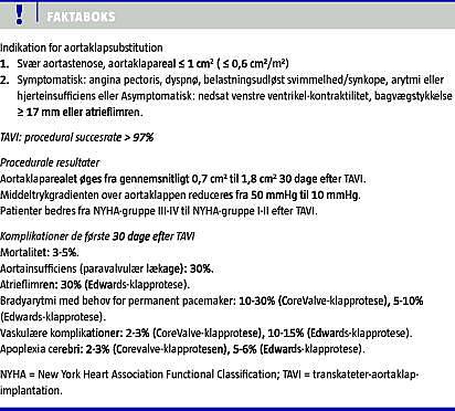 TAVI er i dag en etableret behandlingsmulighed for inoperable patienter og højrisikopatienter med svær AS, og en bedring af symptomer og prognose er veldokumenteret. Langtidsresultater mangler, og klapholdbarheden er fortsat ukendt. Nye klaptyper er under udvikling, og i studier med dansk bidrag vil man kortlægge teknikkens placering i behandlingsspektrummet for AS.