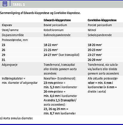 Siden 2007 har to TAVI-systemer været kommercielt tilgængelige på markedet: den kobolt-kromium-ballonekspanderende Edwards-klapprotese (Edwards Lifesciences, Irvine, USA) og nitinolselvekspanderende CoreValve Revalving-klapprotese (Medtronic Inc., Minneapolis, USA) (Figur 1 ). Ud over ekspansionsmåde adskiller de to klapproteser sig på flere måder.