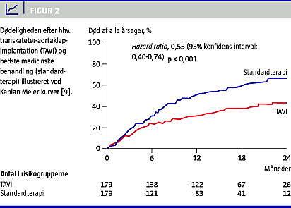 I et andet randomiseret studie med Edwards-klapprotesen [9], hvor inoperable patienter blev randomiseret til TAVI med Edwards-klappen eller bedste medicinske behandling, som for > 80% af tilfældene omfattede ballonvalvutomi af aortaklappen, blev der påvist en betydende prognostisk gevinst ved behandling i form af TAVI frem for medicinsk behandling. Således var etårsmortaliteten hhv. 30% for de patienter, der havde fået foretaget TAVI, mod 50% for de patienter, som havde fået medicinsk behandling (Figur 2 ).