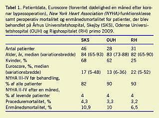 I Danmark udføres behandlingen på Odense Universitetshospital (OUH), Rigshospitalet (RH) samt på Århus Universitetshospital, Skejby (SKS). Antallet af behandlinger, patienternes alder, køn og Euroscore (30-dages forventet mortalitet i forbindelse med koronar bypassoperation) samt New York Heart Associations funktionsklasse (NYHA) fremgår af Tabel 1 . Det fremgår, at vore resultater er på højde med udenlandske opgørelser [7].