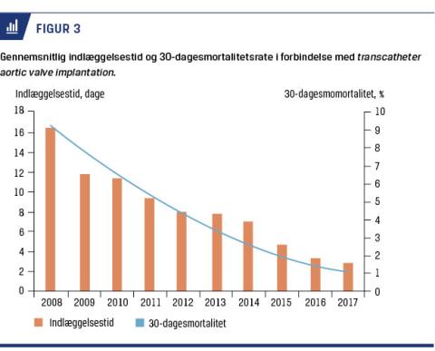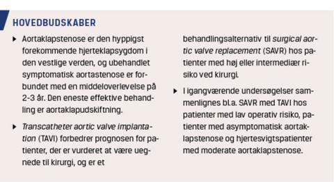 På mindre end et årti er indikationerne for TAVI gået fra symptomatisk, svær aortastenose og høj eller prohibitiv operativ risiko til intermediær risiko. Både videreudvikling af de forskellige transkateterbioproteser og den periprocedurale behandling har medført markant forbedrede resultater over årene. Et stigende antal danske patienter med aortastenose behandles hvert år med TAVI, som ved minimalistprocedure kan foregå i lokalanæstesi med adgang via lysken, og patienterne kan udskrives efter 1-2 dages indlæggelse, uden at det påvirker procedurens sikkerhed.