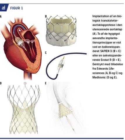 De europæiske og amerikanske guidelines for valg af kirurgisk behandling eller transkateterbehandling af aortastenose blev opdateret i 2017 [13, 14]. Karak-teristika, som vægter til fordel for TAVI, er forventet øget risiko ved operation herunder alder ≥ 75 år, skrøbelighed, tidligere åben hjertekirurgi eller strålebehandling på thorax, porcelænsaorta og skoliose. Om-vendt bør SAVR overvejes, hvis det ikke er muligt at foretage TAVI via arterie femoralis, ved behov for samtidig koronar bypass-grafting, anden hjerteklapkirurgi eller udskiftning af dilateret aorta ascendens og ved bicuspid aortaklap. Hos ældre patienter med aortastenose er aortaklappen oftest tricuspid, mens den hyppigere er bicuspid hos yngre patienter med aortastenose [15]. Anatomien af en bicuspid aortaklap er markant anderledes end en tricuspid aortaklap, og risikoen for paravalvulær lækage og overledningsforstyrrelser med behov permanent pacemaker er større ved TAVI i en