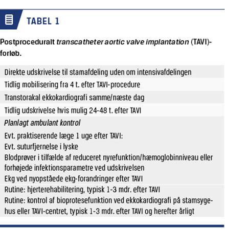 Den tidlige mobilisering og udskrivelse reducerer hospitalsomkostningerne samt risikoen for postprocedural delirium [19, 22]. Alle patienter tilbydes hjerterehabilitering og ekkokardiografi via stamsygehuset eller TAVI-centret i månederne efter proceduren. Ved behov planlægges opfølgning hos egen læge med henblik på kontrol for komplikationer efter udskrivelsen (Tabel 1).Den antitrombotiske behandling efter TAVI er clopidogrel 75 mg kombineret med acetylsalicylsyre 75 mg dagligt i tre måneder efterfulgt af acetylsalicylsyre 75 mg dagligt livslangt. Hvis patienten har atrieflimren eller anden indikation for antikoagulation, gives der oral antikoagulantia livslangt – evt. kombineret med clopidogrel 75 mg eller acetylsalicylsyre 75 mg dagligt i tre måneder. Yderligere er der indikation for livslang endokarditisprofylakse efter vanlige retningslinjer.
