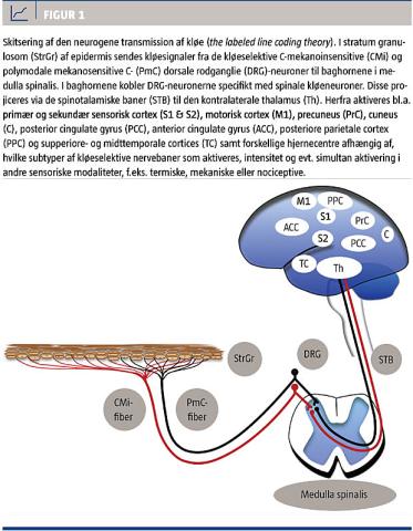 Det har tidligere været uklart, hvordan specifikke cytokiner, proteaser og neuropeptider fremkalder smerte eller kløe, afhængigt af i hvilket lag i huden de introduceres. Forklaringen er fulgt med hypotesen the labeled line coding theory [9], hvor man foreslår, at neurogen transmission af kløe foregår via særskilt serieforbundne nervefibre, labeled lines (Figur 1). En receptors kløespecificitet afhænger således af, hvilken nervefiber den er udtrykt på, hvilket forklarer, hvorfor histamin kan fremkalde kløe i epidermis/øvre dermis og smerte i nedre dermis. Hypotesen er i dag så velunderbygget, at den synes at være fundamental for forståelsen af kløesignaleringen [1, 9, 10].