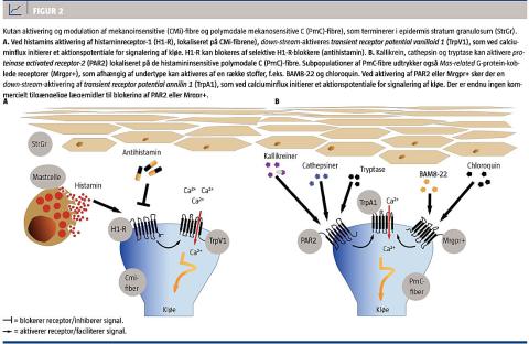 Hovedparten af kløefibrene tilhører imidlertid de såkaldte polymodale C-fibre (PmC), hvoraf langt de fleste er ufølsomme for histamin. Disse nervefibre har et mindre receptivt felt end CMi (Figur 1), udløser ikke et flare-respons ved aktivering og synes i højere grad at være involveret i kronisk kløe. Cowhage er et klassisk nonhistaminergt pruritogen fra den tropiske plante Mucuna pruriens, på dansk fløjlsbønne. Ved hudkontakt med plantens spiculae frigives mucunain, som kan aktivere proteaseaktiveret receptor-2 (PAR2) [12]. PAR2 er bl.a. udtrykt på subpopulationer af kløeselektive PmC-fibre og har affinitet til en række proteaser, herunder tryptase, cathepsiner og kallikreiner (Figur 2B), som frigives ved inflammatoriske hudsygdomme f.eks. atopisk dermatitis, hvor både ekspressionen af PAR2 og serumniveauet af tryptase og kallikreiner er fundet forøget [13-15].