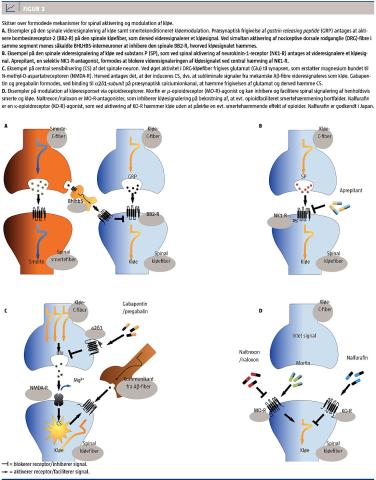 f.eks. via opioidreceptorerne [20], er neurotransmittere og receptorer i og omkring baghornsneuronets synapsedannelse oplagte mål for farmakologisk supprimering af kløe (Figur 3A-D) (Tabel 1).