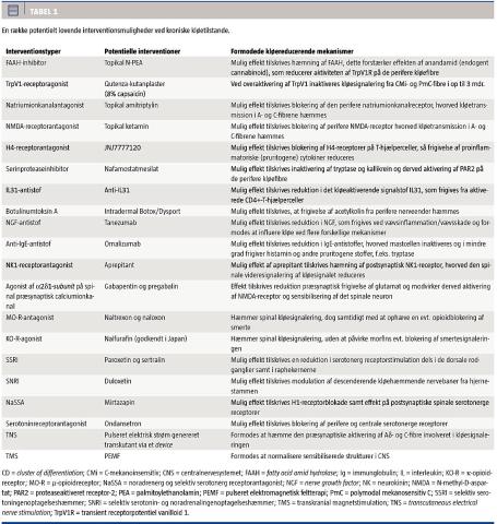 Da flere dynamiske processer kan influere signalering af kløe, giver det mening at anlægge en mekanistisk tilgang til patienter med kronisk kløe. Dette bakkes op af, at nyere farmakologiske interventioner er målrettet forskellige niveauer i signaleringsvejene med mere eller mindre succes [15, 29, 30]. Mekanismerne bag kronisk kløe kan imidlertid være komplekse, og der er endnu lang vej, før behandling af den enkelte patient relevant kan målrettes cellulære strukturer, signalstoffer og receptorer i og omkring kløeselektive DRG-neuroner, spinale neuroner, interneuroner og/eller hjerneområder. I Tabel 1 skitseres nyere potentielt lovende interventionsmuligheder ved kroniske kløetilstande. For hovedparten af de listede interventioner er såvel indikationerne som behandlingseffekten stort set udokumenteret, hvilket kalder på velgennemførte klinisk kontrollerede behandlingsstudier og udvikling af værktøjer til mekanistisk subklassificering af de kroniske kløetilstande, f.eks. tilstedeværelse af alloknesis.